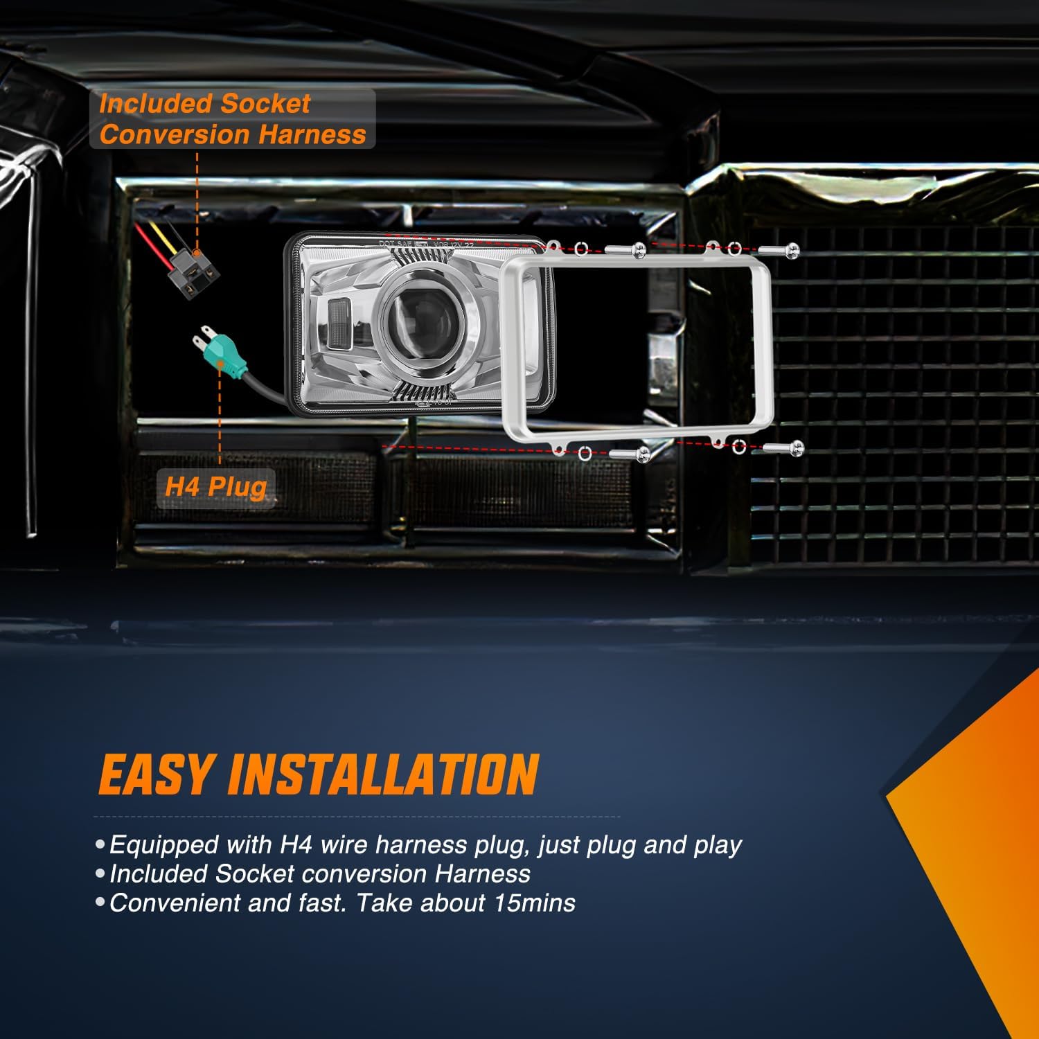 - Plug and Play - standard H4 plug for quick installation. We also provide the socket conversion harness for non-standard plugs, so you don’t have to worry about plug mismatches, and the extension screws make the whole process effortless